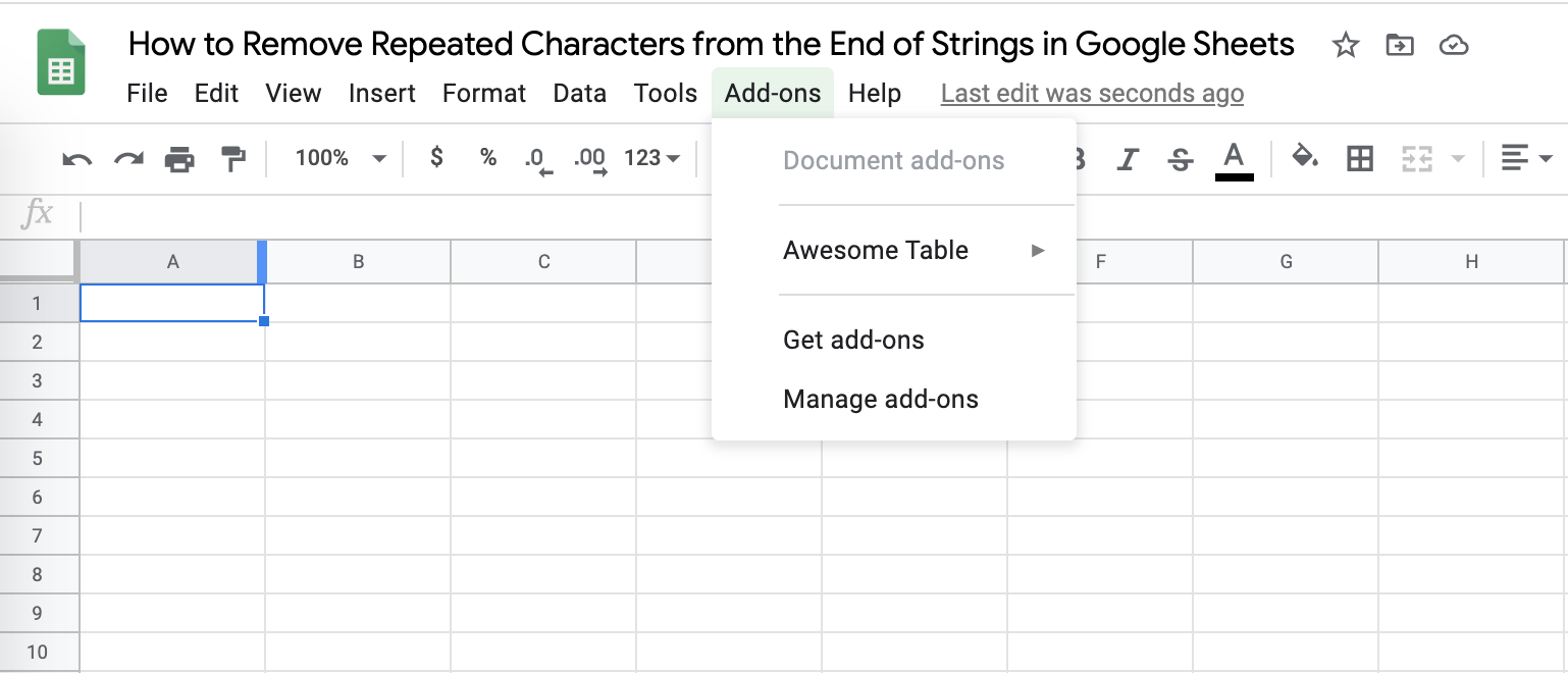 - Click on Add-ons on the Menu Bar of your Google Sheets document. You might have some existing add-ons installed already. Choose “Get add-ons” from the drop-down menu, which will bring you to the G Suite Marketplace.