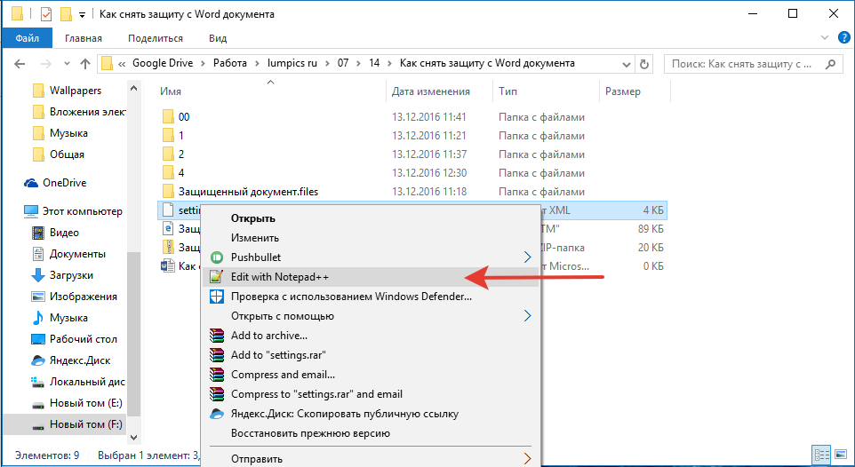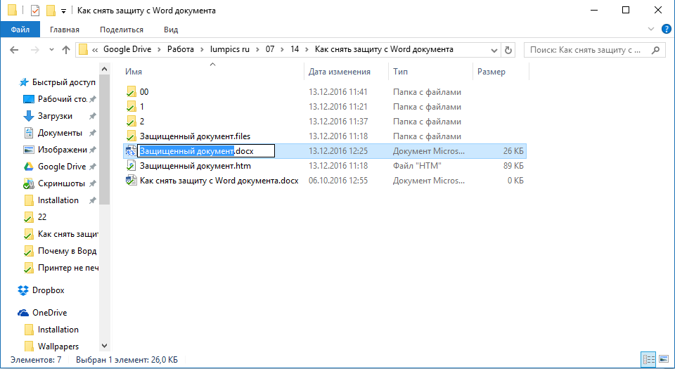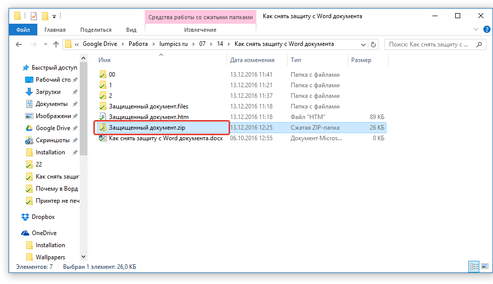 Откройте папку, в которой содержится защищенный файл, и измените его расширение с DOCX на ZIP. Для этого выполните следующее: