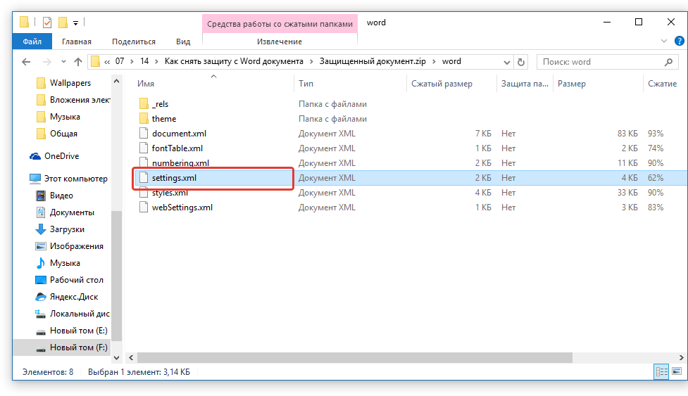 1. Откройте zip-архив, перейдите в папку word и найдите там файл «settings.xml».