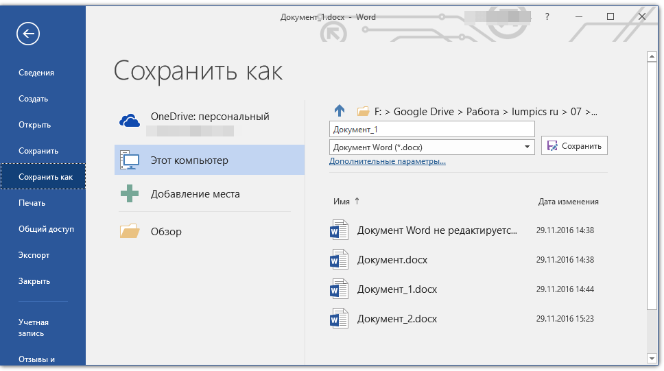 Для того чтобы предоставить общий доступ к документу, прежде всего его необходимо сохранить в облачном хранилище OneDrive.