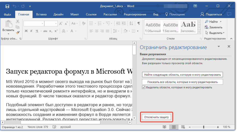 1. В окне «Ограничить редактирование» нажмите кнопку «Отключить защиту».