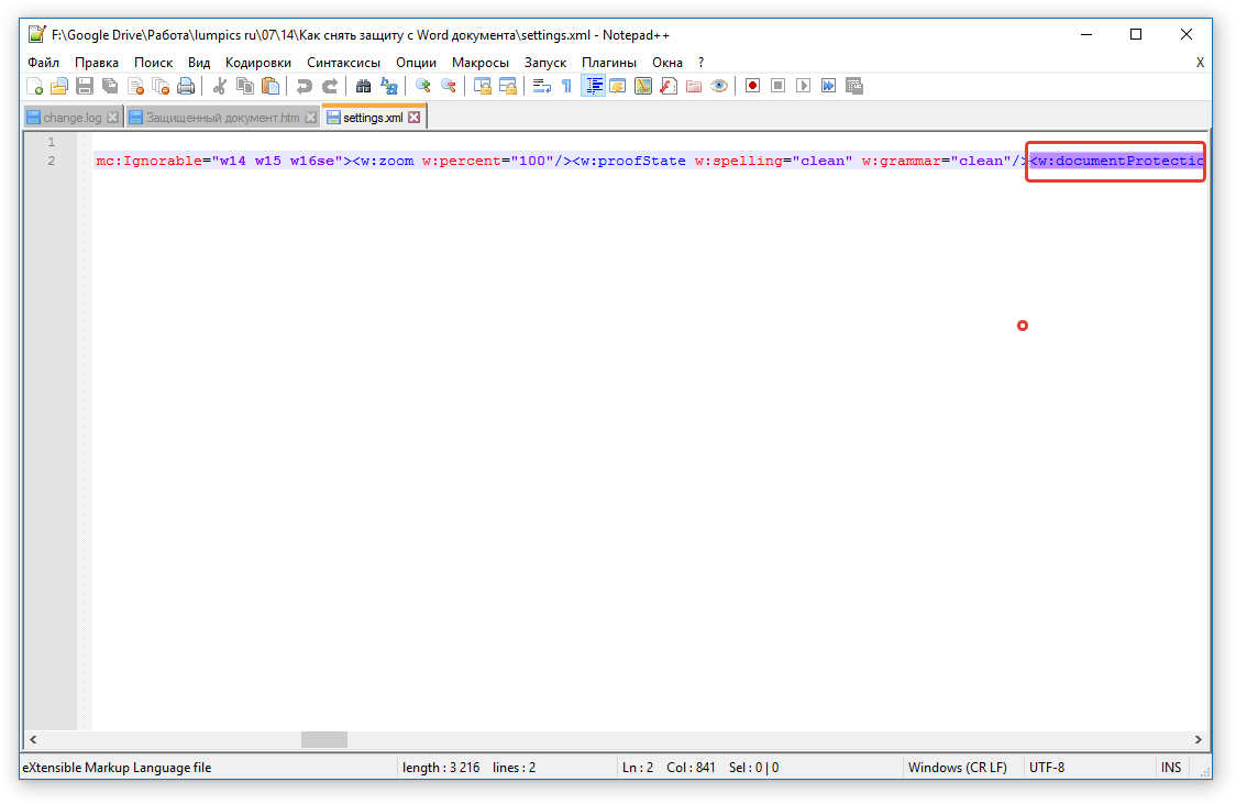 4. Найдите через поиск размещенный в угловых скобках тег w:documentProtection … , где «…» — это пароль.