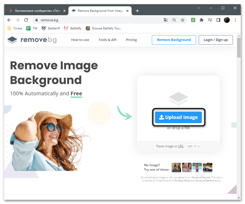 На его главной странице сразу приступите к загрузке изображения или перенесите его прямо на вкладку.