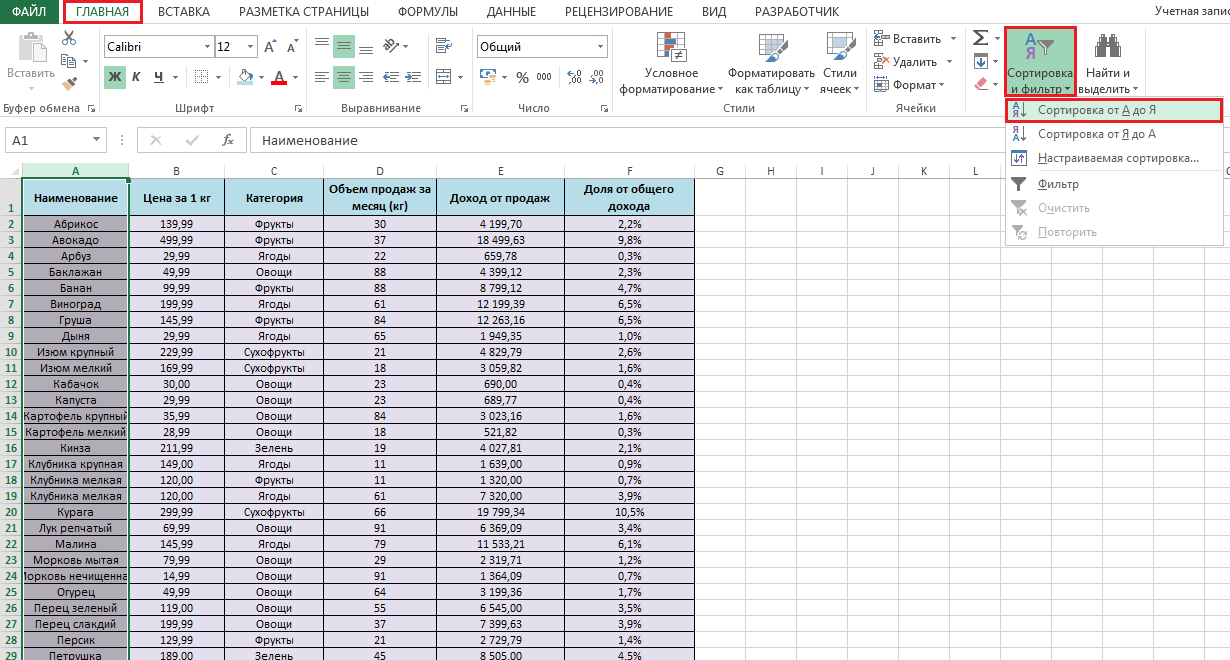 Возьмем, к примеру, ниже представленную таблицу. Допустим, наша цель упорядочить по алфавиту наименования продукции. В этом случае выделяем любую ячейку из столбца с наименованиями (например, А1). Затем находим и нажимаем кнопку «Сортировка и фильтр». Так как нам требуется выполнить сортировку по алфавиту, выбираем соответствующий пункт — «Сортировка от А до Я».