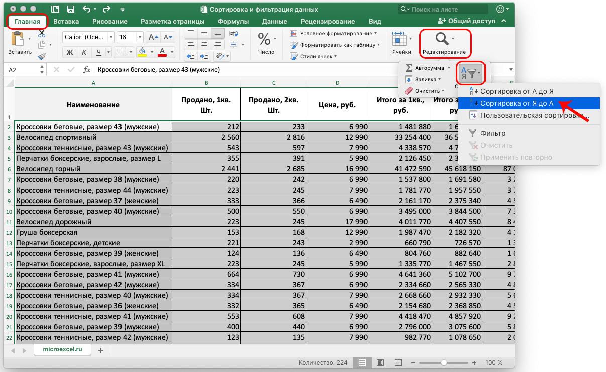 Если требуется вывести данные в обратном порядке, то на этот случай также предусмотрена соответствующая функция — «Сортировка от Я до А».