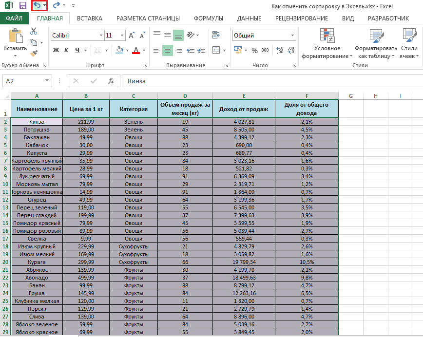 Сразу же отметим, что каких-либо встроенных инструментов для отмены сортировки не предусмотрены. Однако это не означает, что в MS Excel нельзя вернуть таблицу к исходному виду. Есть несколько хитростей, которые позволят решить данную задачу и, при необходимости, сохранить первоначальный вид документа.