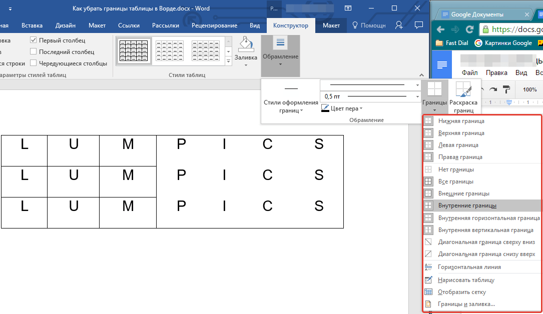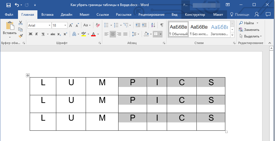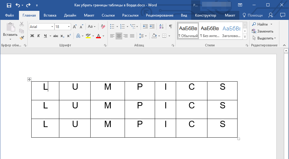 в верхнем левом углу таблицы. , чтобы выделить ее и отобразить вкладку Конструктор таблиц. На вкладке Конструктор таблиц щелкните стрелку параметра Границы, а затем выберите пункт Нет. Совет: Обязательно выберите пункт Границы, а не Стили границ.