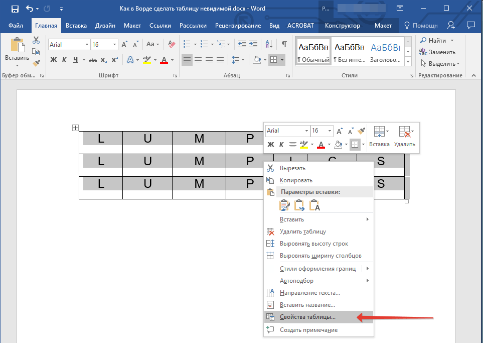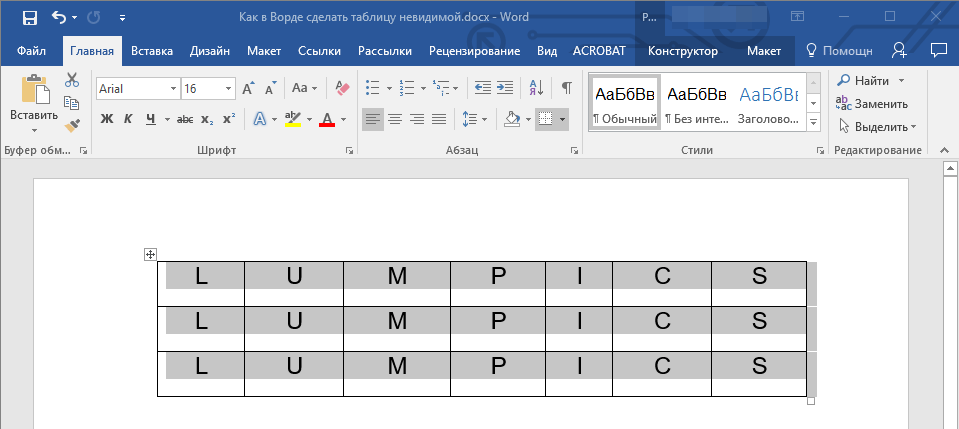 Делаем таблицу невидимой с помощью кнопки «Границы». После того, как таблица выделена, нужно перейти на вкладку «Конструктор» и нажать на стрелочку рядом с кнопкой «Границы». В открывшемся меню нужно выбрать вариант «Нет границ». После чего выделенная вами таблица должна стать невидимой.
