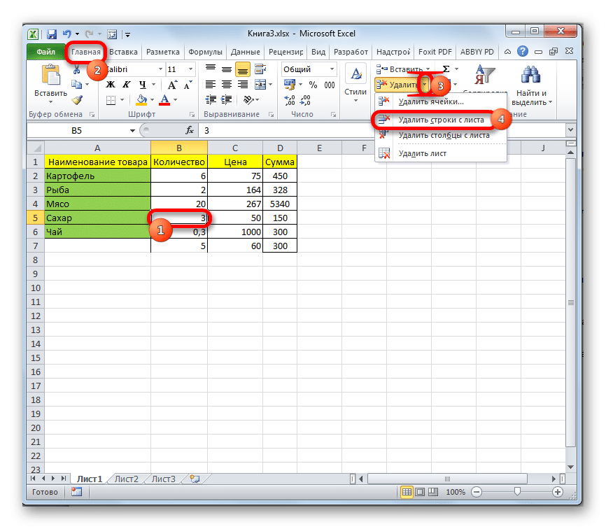 Алгоритм действий по удалению выделенной строки с рабочего листа стандартным инструментом программы