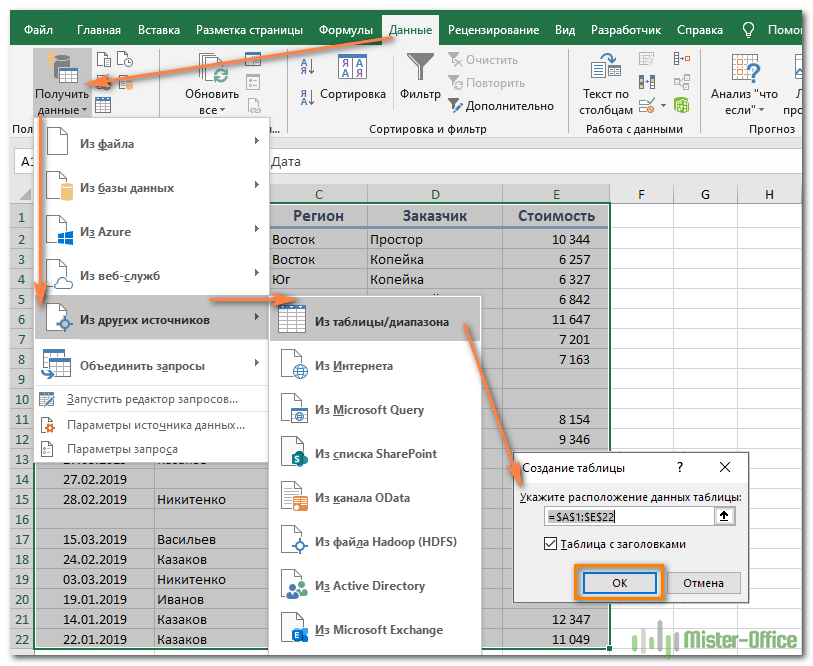 - В меню контекстного типа нажать по строке «Из других источников» и далее выбрать вариант «Из таблицы/диапазона». Теперь откроется небольшое меню, где надо поставить галочку рядом с параметром «Таблица с заголовком» и щелкнуть по «ОК».
