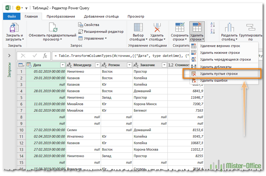 Удаление пустых строчек в редакторе Power Query. Пошаговый алгоритм