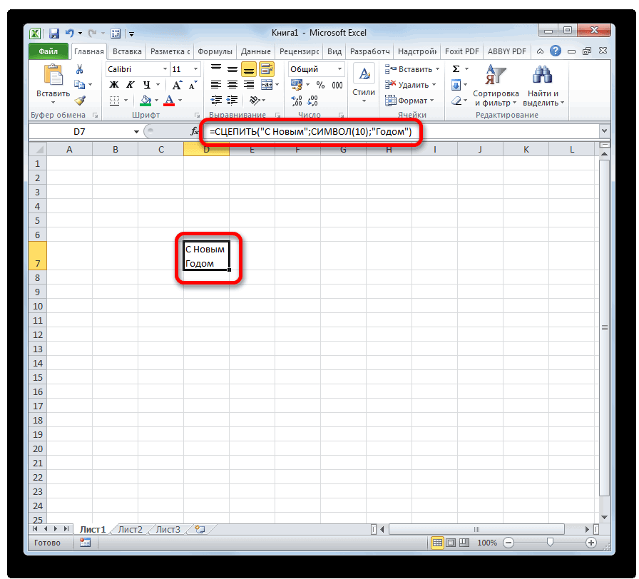 Вручную с клавиатуры компьютера ввести формулу «=СЦЕПИТЬ(«ТЕКСТ1″;СИМВОЛ(10);»ТЕКСТ2»)». Вместо слов «ТЕКСТ1» и «ТЕКСТ2» надо вбить конкретные значения, т.е. написать требуемые символы.