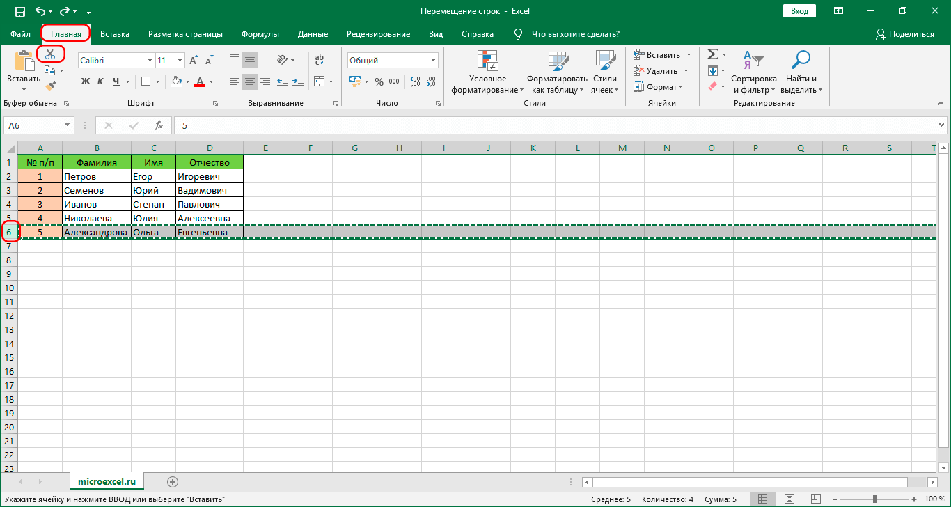 - На вертикальной координатной панели находим номер требуемой строчки, жмем на него левой клавишей мыши. Данное действие привело к выделению всей сроки. Находим в ленте инструментов блок «Буфер обмена», который размещен во вкладке «Основная», и избираем «Вырезать» (значок в виде ножниц). Также можно пользоваться контекстным меню (вызывается щелчком правой клавишей мыши по выделенном фрагменту) в котором избираем соответственный пункт “Вырезать”.