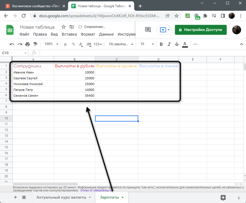 Существует множество разных ситуаций, когда нужно преобразовать одну валюту в другую. В качестве примера я взял таблицу с сотрудниками, имеющейся выплатой в рублях и необходимостью отобразить, сколько они получат в другой валюте. Это актуально, например, когда сотрудники работают в других странах и с ними есть договоренность об оплате труда в конкретной валюте. Саму исходную таблицу вы видите на следующем скриншоте.