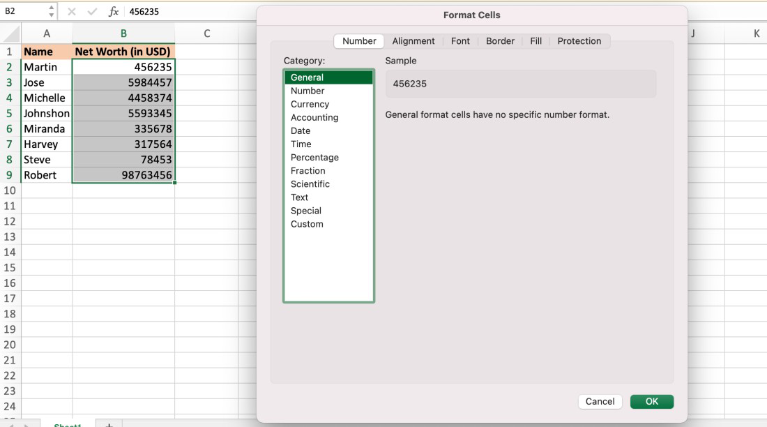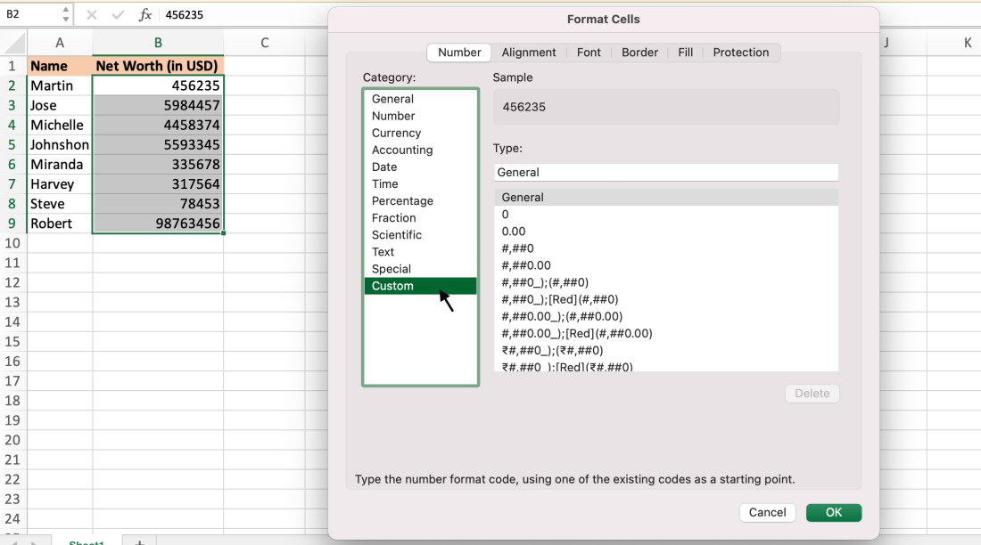 Шаг 2: Нажмите Ctrl + 1(command + 1 , если используете macOS) на клавиатуре, чтобы открыть диалоговое окно формат ячеек. Шаг 3: На вкладке «Число» с левой стороны, в «Параметрах категории», выберите «Пользовательский параметр». Шаг 4: В опции Type введите #,##0, “M”, в примере мы можем предварительно убедиться, что число 253678654 будет отображаться как 254 M.