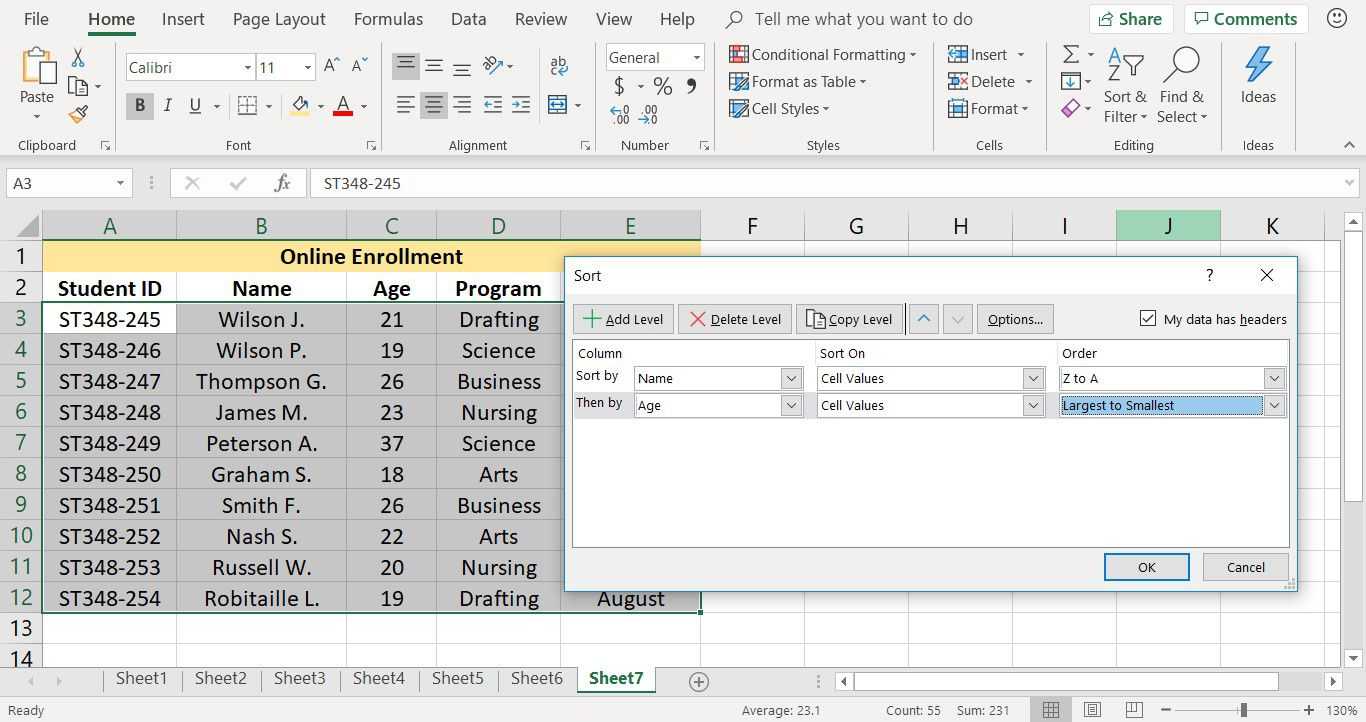 Ответ на всё это — расширенная сортировка, при которой вы можете установить несколько уровней сортировки данных. Давайте рассмотрим последний пример, используя образцы данных.