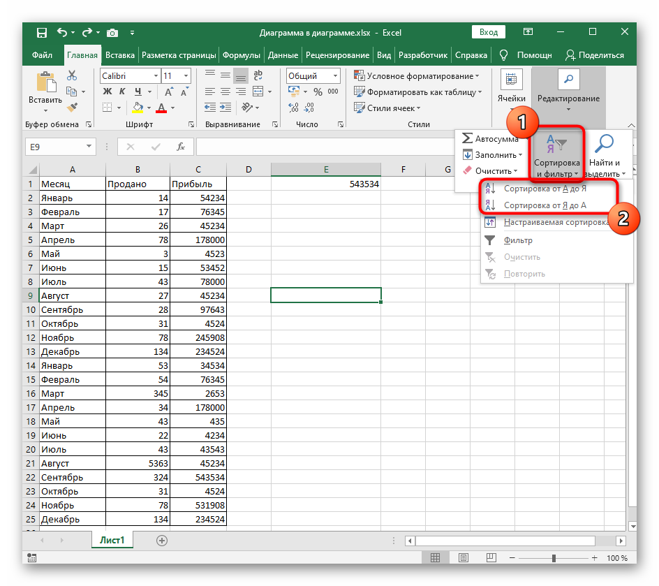 Данный метод сортировки осуществляется так же, как по алфавиту. Различие будет лишь в наименовании функций: «По возрастанию», а также, «По убыванию».