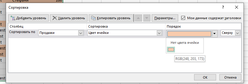В следующем выпадающем списке можно выбрать, по каким параметрам сортировать диапазон. Например, если Вы использовали заливку для ячеек или меняли цвет шрифта, то возможно задать порядок по данным параметрам.