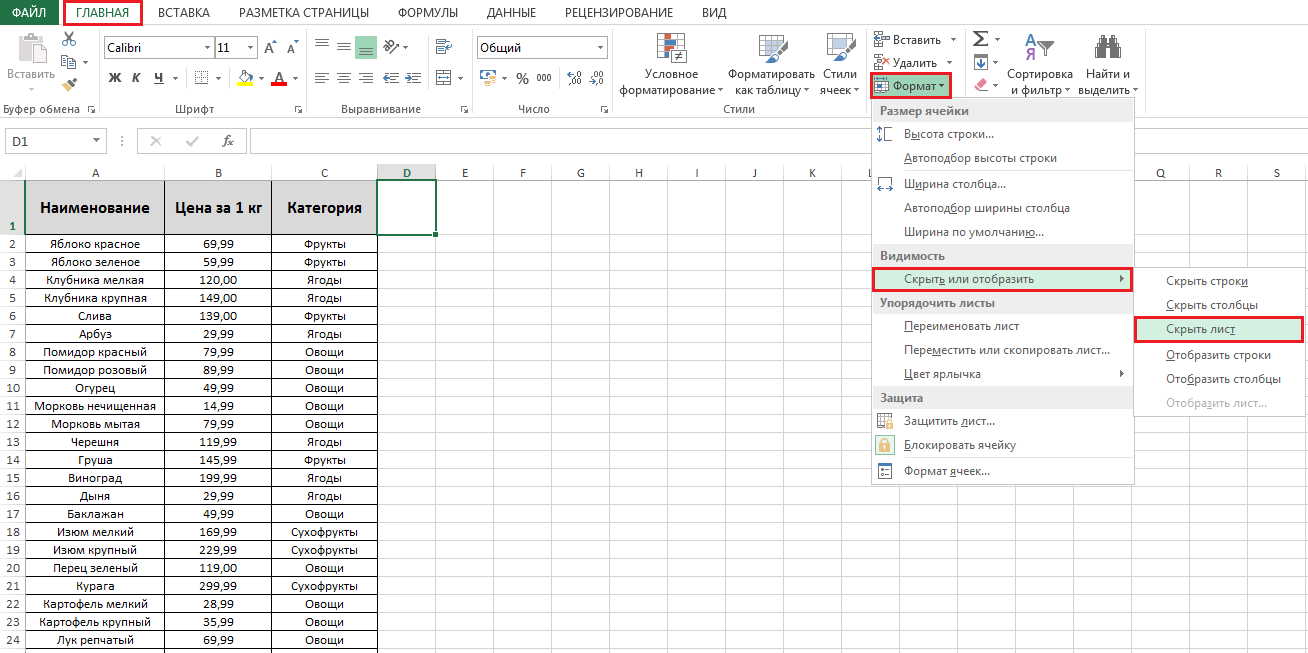 Достичь аналогичного результата можно и несколько иначе, обратившись к элементам управления ячейками во вкладке «Главная». Для этого перейдите на тот лист, который требуется скрыть, разверните меню кнопки «Формат», наведите указатель курсора на пункт «Скрыть или отобразить» и выберите соответствующую опцию.