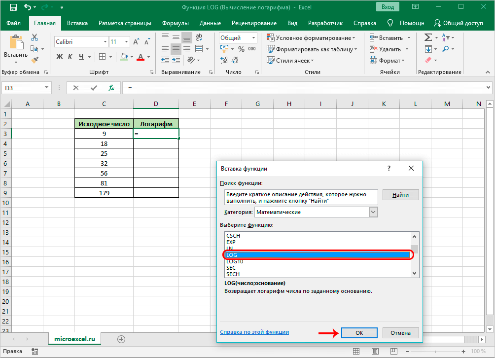 - В открывшемся списке операторов кликнуть по строке «LOG», а затем нажать на «ОК» для подтверждения действия. Теперь должно отобразиться меню настроек логарифмической формулы.
