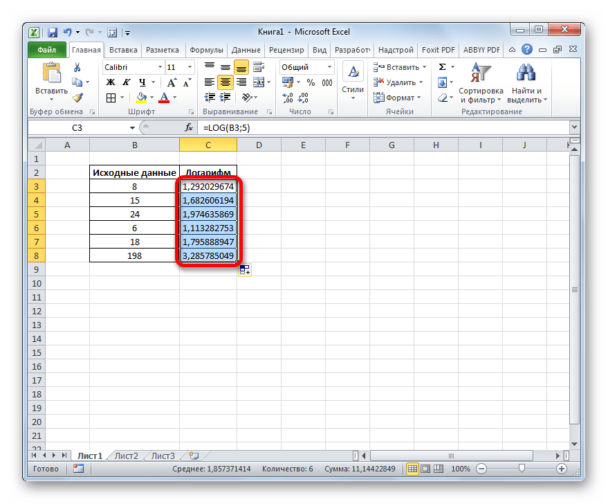 - Для выполнения расчетов для всех остальных чисел, представленных в таблице, копируем формулу с помощью маркера заполнения, так же, как и в прошлый раз. Как видите, результаты вычисления логарифмов чисел отображаются в ячейках, а это значит, что задание выполнено.