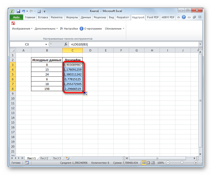 Проделать ту же операцию с оставшимися числами в таблице, чтобы посчитать их логарифм.