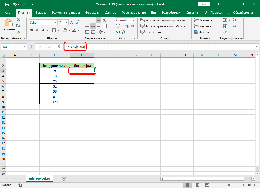 - Результат обработки функцией ЛОГ сразу отображается в ячейке, указанной нами на первом шаге данной инструкции.