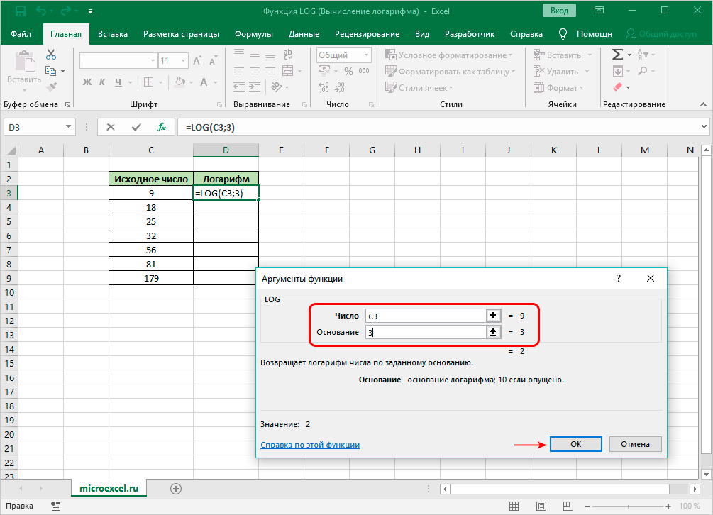 - Нажать на «ОК» или на «Enter» и проверить результат. Во втором столбце должен посчитаться логарифм указанного числового значения.
