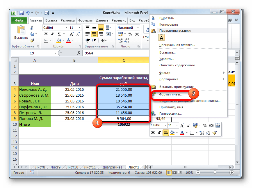 - Выберите диапазон чисел с разделителями. Щелкните выделение правой кнопкой мыши. В появившемся меню выберите пункт «Форматировать ячейки…».