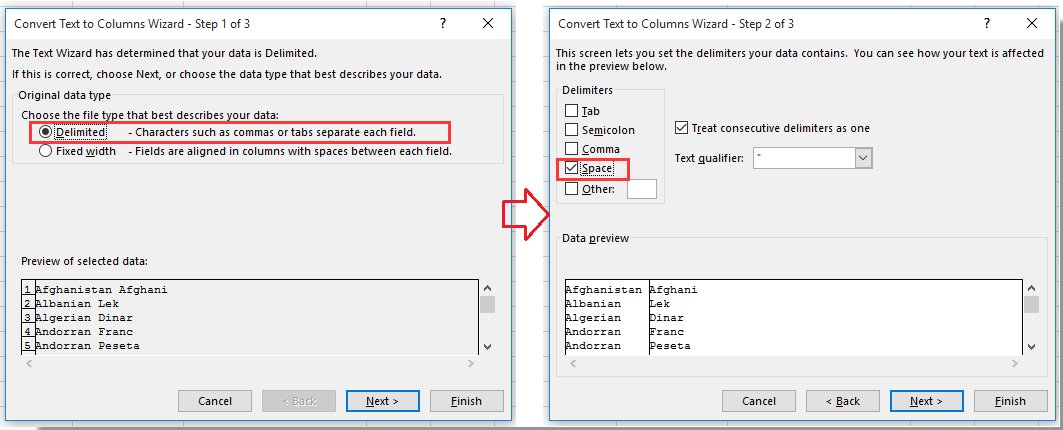 2. На первом этапе Преобразование текста в столбцы волшебник, проверьте разграниченный и нажмите Следующая> в шаг 2 мастера, и проверьте Space вариант под Разделители раздел. Смотрите скриншот: