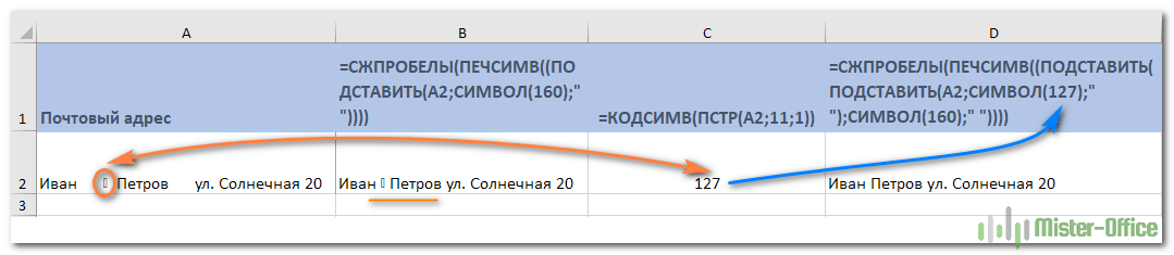 - В ячейке C3 замените CHAR (127) обычным пробелом («»), а затем удалите его: