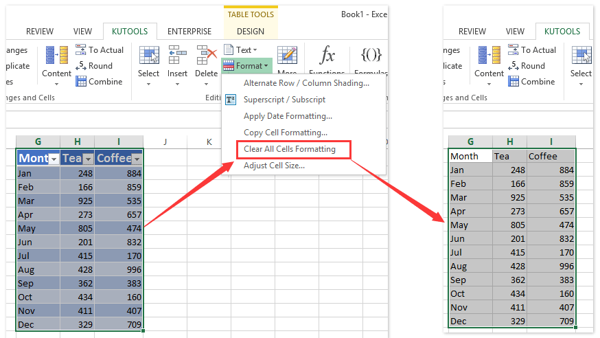 Изберите таблицу, стиль которой вы желаете удалить, и нажмите Kutools > Формат > Очистить форматирование всех ячеек. Смотрите снимок экрана: