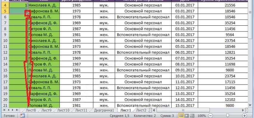 - остается лишь перетащить маркер выделения на необходимое количество ячеек.
