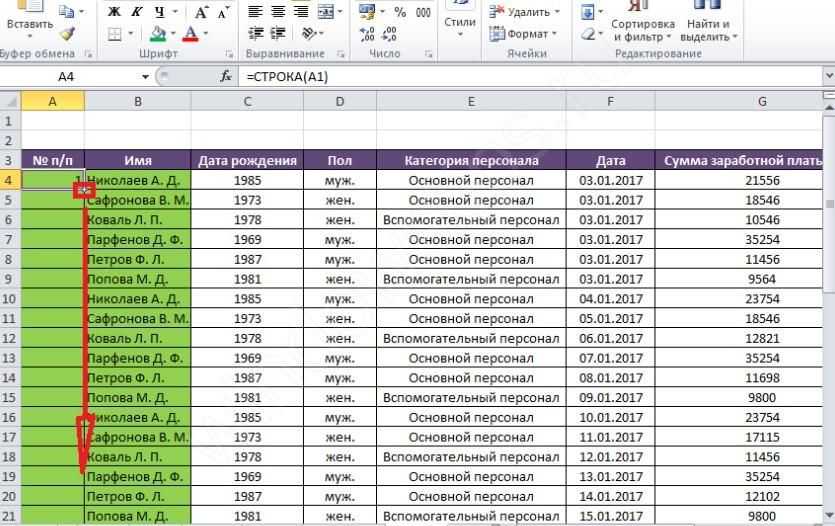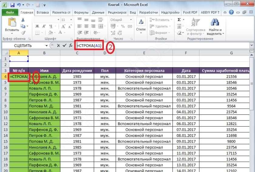 Данный метод для автоматической нумерации строк предполагает использование фукнции “СТРОКА”.