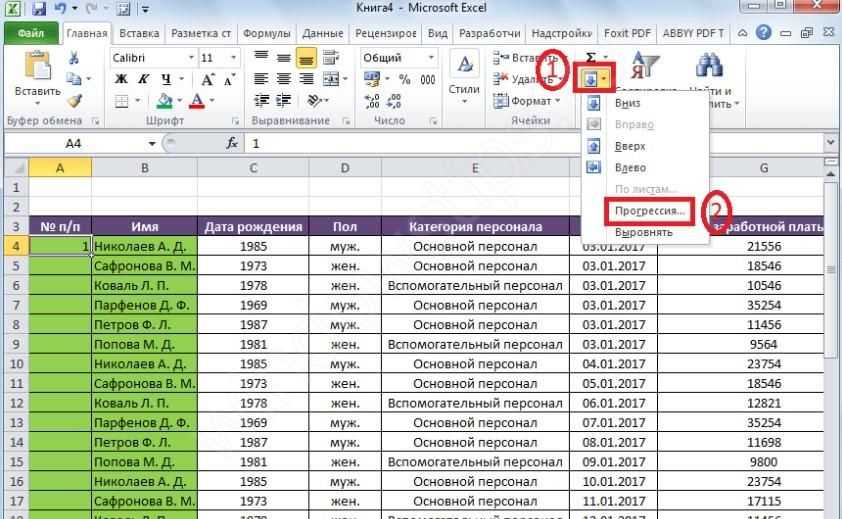 - Нажать «заполнить». Далее, в выпадающем меню, выбрать «прогрессия».