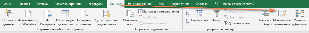 Если «Мгновенное заполнение» включено, но не предлагает вам никаких вариантов, можно принудительно запустить этот инструмент вручную на вкладке «Данные» или нажав сочетание клавиш Ctrl+E.