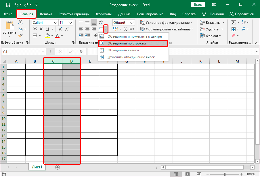 Действия для “деления” ячейки на несколько строк аналогичны, правда, в этом случае объединение для каждого столбца придется делать вручную.