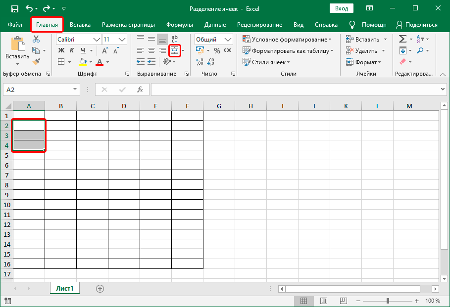 Аналогичным образом можно разделить ячейки, полученные путем объединения нескольких в одну.