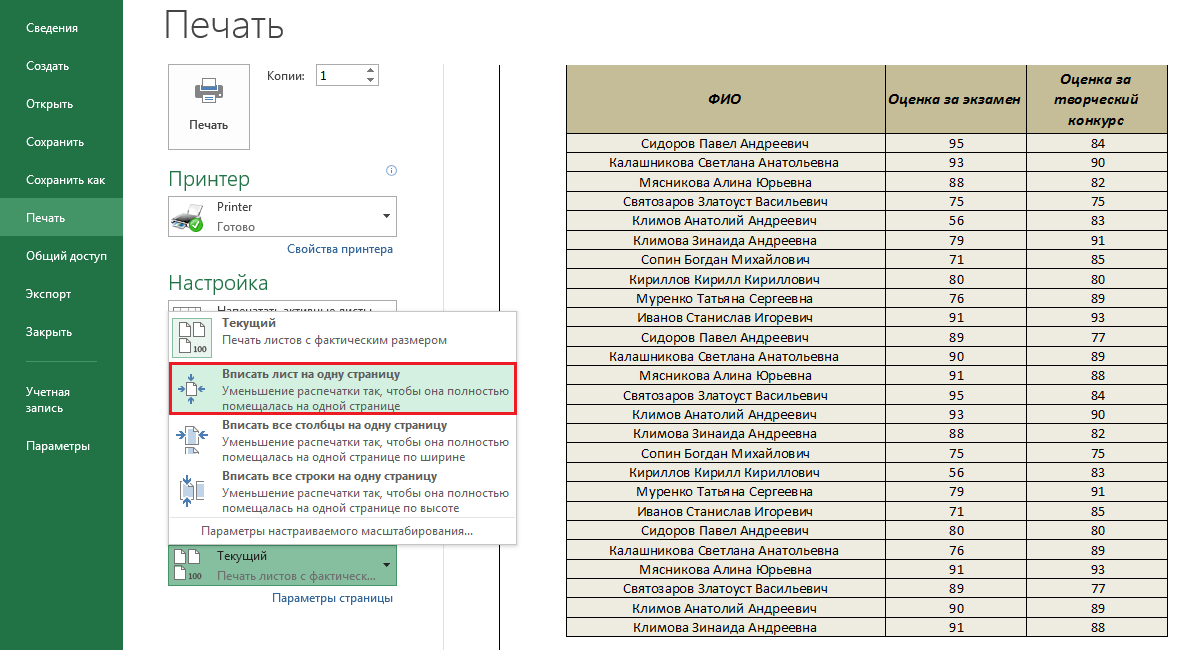Как видно, изменение области печати позволило вписать строки и столбцы всей таблицы на одну страницу. Причем ею удобно пользоваться, так как текст остался читаемым. При необходимости можно воспользоваться альтернативным вариантом масштабирования. Открываем страницу печати и в нижней окне настроек меняем параметр «Текущий» на «Вписать лист на одну страницу».