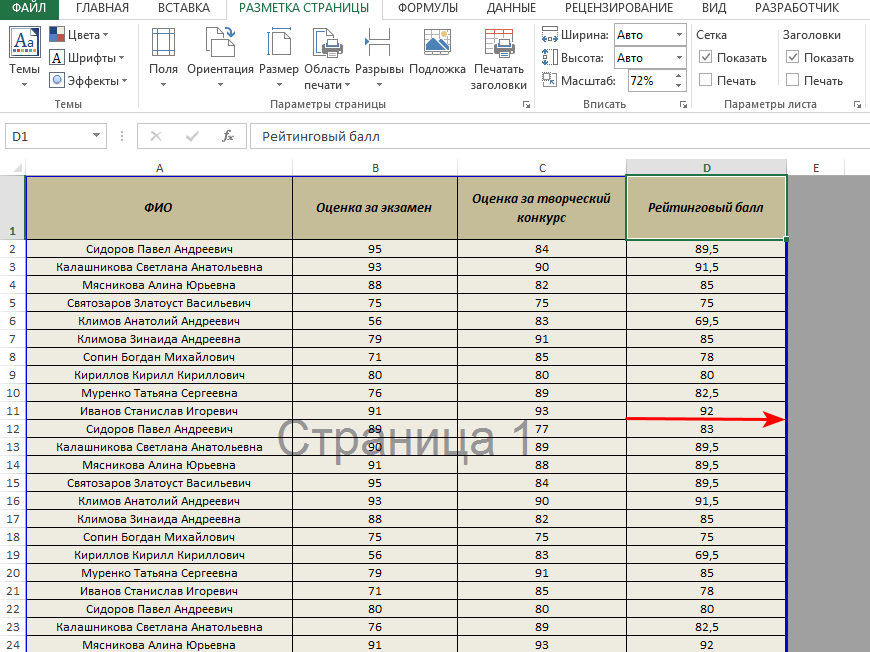 - Сменить текущую ориентацию и посмотреть на расположение таблицы. Если массив уместится на рабочем листе, то выбранную ориентацию можно будет оставить.