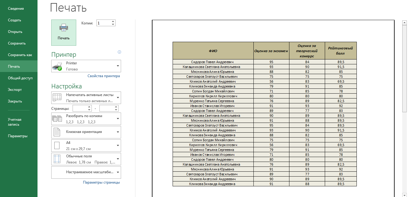 - печати как всех данных листа, так и определенного диапазона ячеек;
