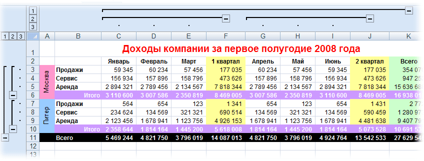 Такой способ скрытия ненужных данных гораздо удобнее — можно нажимать либо на кнопку со знаком «+» или «—«, либо на кнопки с цифровым обозначением уровня группировки в левом верхнем углу листа — тогда все группы нужного уровня будут сворачиваться или разворачиваться сразу.