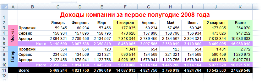 - скрывать итоги по месяцам и по кварталам, оставляя только итог за полугодие