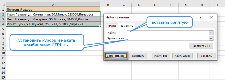 Если вы хотите вставить разрыв строки там, где в адресе есть запятая, вы можете сделать это с помощью диалогового окна НАЙТИ и ЗАМЕНИТЬ.