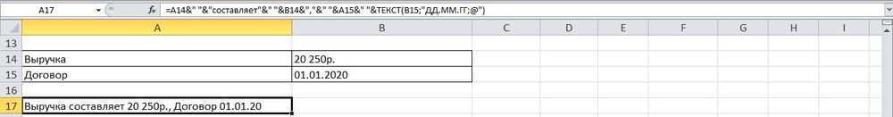 Необходимо объединить текстовые и числовые значения с помощью формулы =A14&» «&»составляет»&» «&B14&»,»&» «&A15&» «&ТЕКСТ(B15;»ДД.ММ.ГГ;@»).
