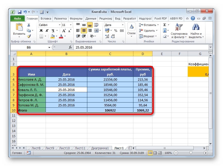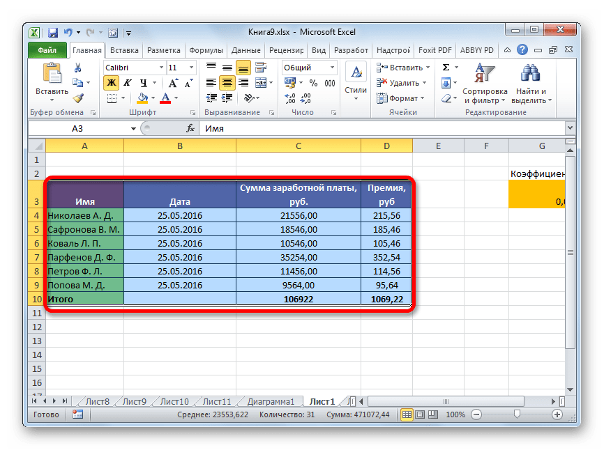 Таблица будет выделена, как единый диапазон.