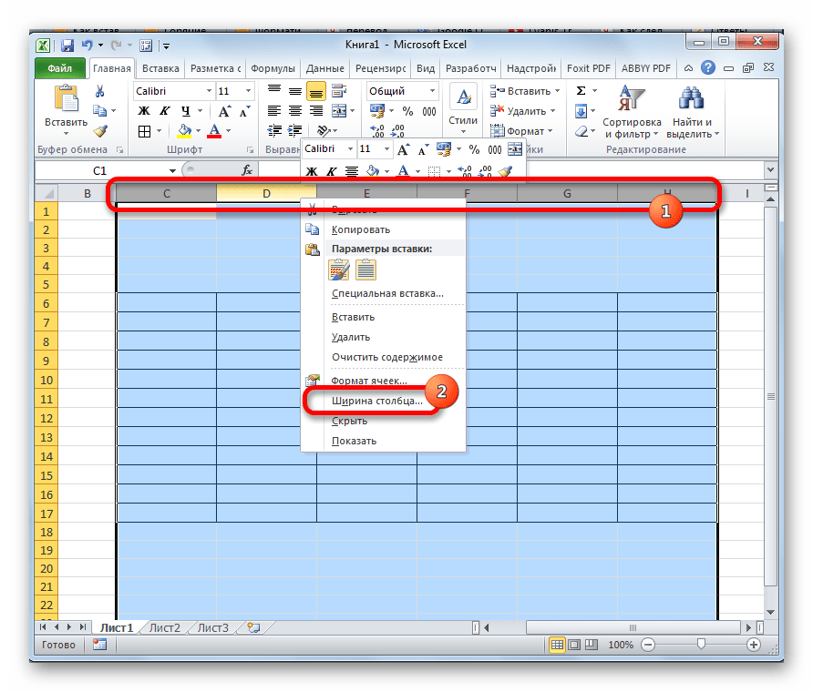 То же проделать для вертикальных рядов данных — только вместо «Высоты строки» кликнуть по пункту «Ширина столбца».