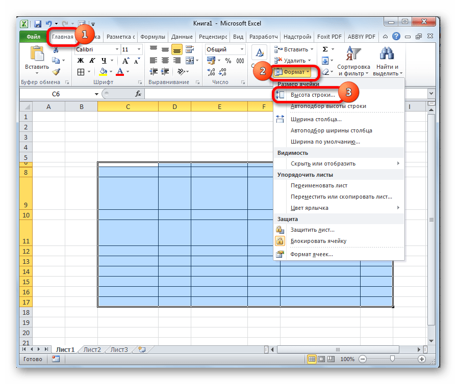 Редактировать можно не только ширину столбцов и ячеек. Программа предлагает изменить размеры строк. Для этого следует выделить таблицу в excel или те ячейки, которые необходимо уменьшить/увеличить. Вызовете контекстное меню и выберите пункт «Высота строки». В появившемся окне устанавливаем нужный размер.