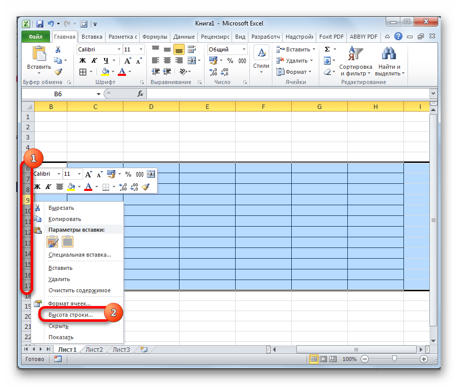 Щёлкнуть по её порядковому номеру правой клавишей мыши, выбрать пункт «Высота строки».
