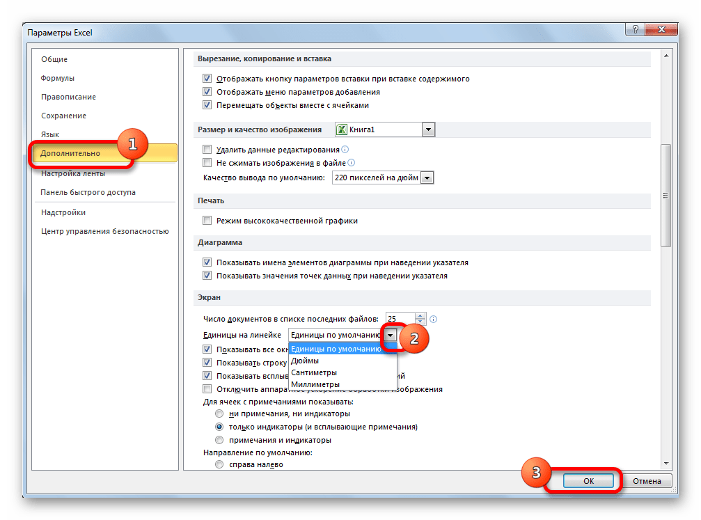 При работе в режиме разметки страницы вы можете указать величину полосы объектов в сантиметрах, миллиметрах или дюймах. Чтобы поменять меру, нажмите «Файл» — «Параметры» и в категории «Дополнительно» найдите раздел «Экран». В выпадающем меню «Единицы на линейке» установите систему мер, которая вам больше подходит.